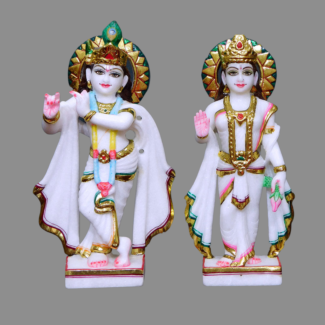 Experience the divine love and beauty of Radha Krishna with this exquisite Makrana white marble statue. Handcrafted by skilled artisans, this Radha Krishna murti features a smooth finish, elegant detailing, and a beautifully crafted peacock feather (mor pankh) that adds charm and grace. Perfect for temple worship, home décor, or gifting, this marble Radha Krishna idol radiates spirituality, positivity, and devotion in every detail.