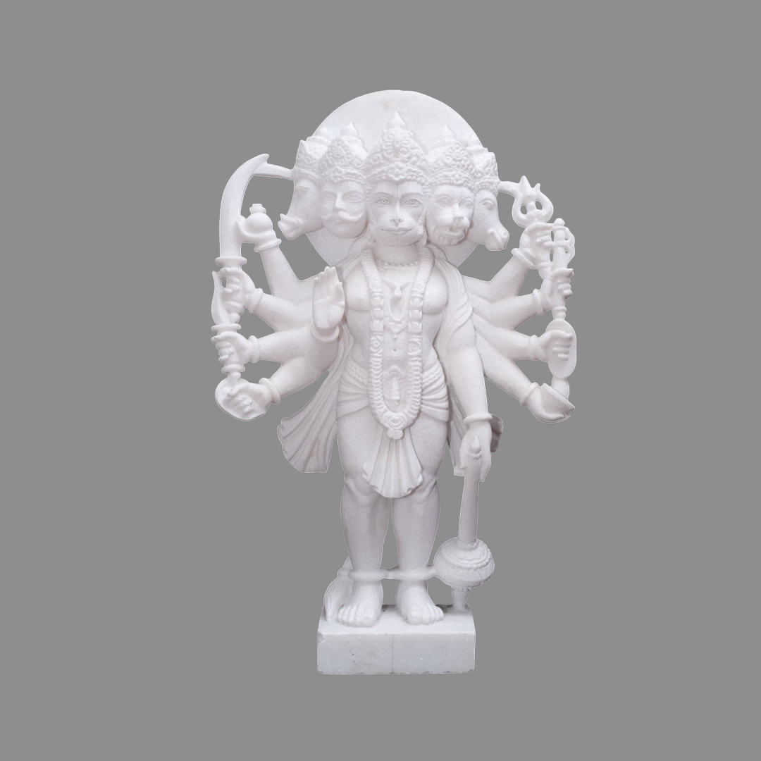 Invite divine protection into your home with this Panchmukhi Hanuman marble statue, depicting Lord Hanuman with five faces. This white marble Hanuman murti is believed to ward off evil and negative energies, making it ideal for placement at the doorway, living room, or pooja room. Perfect for home temple decor, spiritual worship, and devotional gifting, this handcrafted Panchmukhi Hanuman idol enhances positivity, peace, and divine energy in your sacred space.