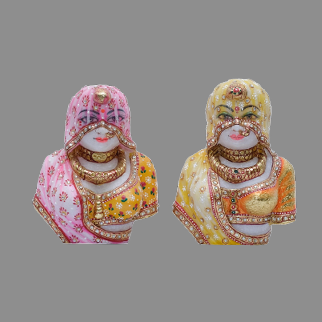 Add a traditional Marwari-Rajasthani touch to your home with this beautiful combo of Pink and Yellow Banni Thanni bust sculptures. These handcrafted pieces feature intricate multicolored meenakari artwork and sparkling Kundan stone embellishments. Perfect for enhancing your ethnic home décor or Rajasthani art collection, these statues bring vibrant color and cultural elegance to any space.