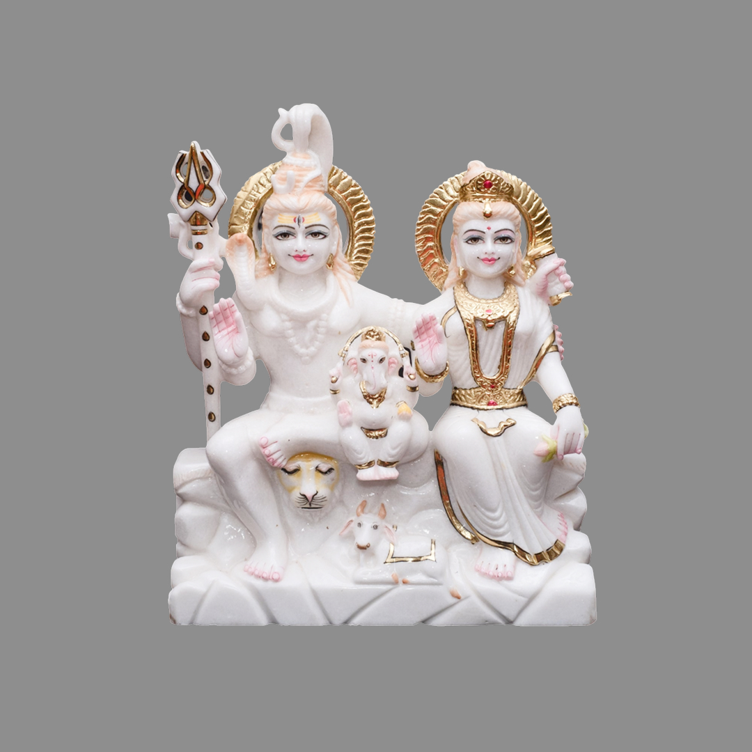 This Shiv Parivar Marble Statue is crafted from premium Makrana White Marble, sourced from the renowned quarries of Rajasthan. The idol beautifully depicts Lord Shiva with Goddess Parvati, Lord Ganesha, and Nandi, symbolizing unity, protection, and divine blessings. Perfect for home temples, pooja rooms, and spiritual décor, this white marble Shiv Parivar Murti radiates serenity and sacred energy. Enhance your sacred space with this handcrafted marble idol of Shiv Parivar.