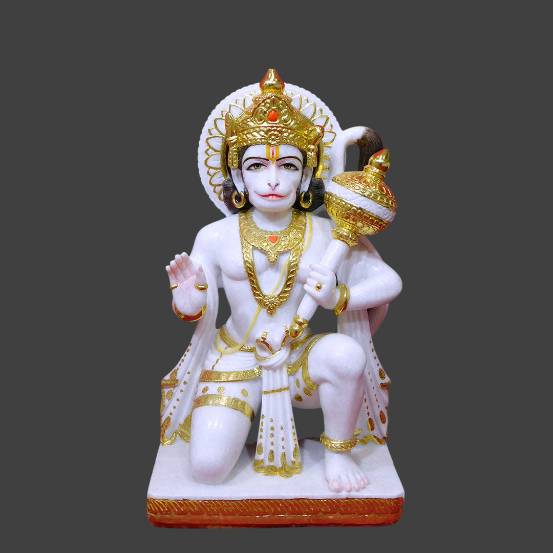 This Sitting Aashirwad Hanuman Ji Marble Statue with Gada, crafted from pure Vietnam marble, beautifully symbolizes strength, devotion, and protection. The intricate detailing and smooth finish enhance its divine charm, making it a perfect idol for temple or home décor. This Hanuman Ji murti radiates positivity, power, and blessings, bringing spiritual grace to your sacred space.