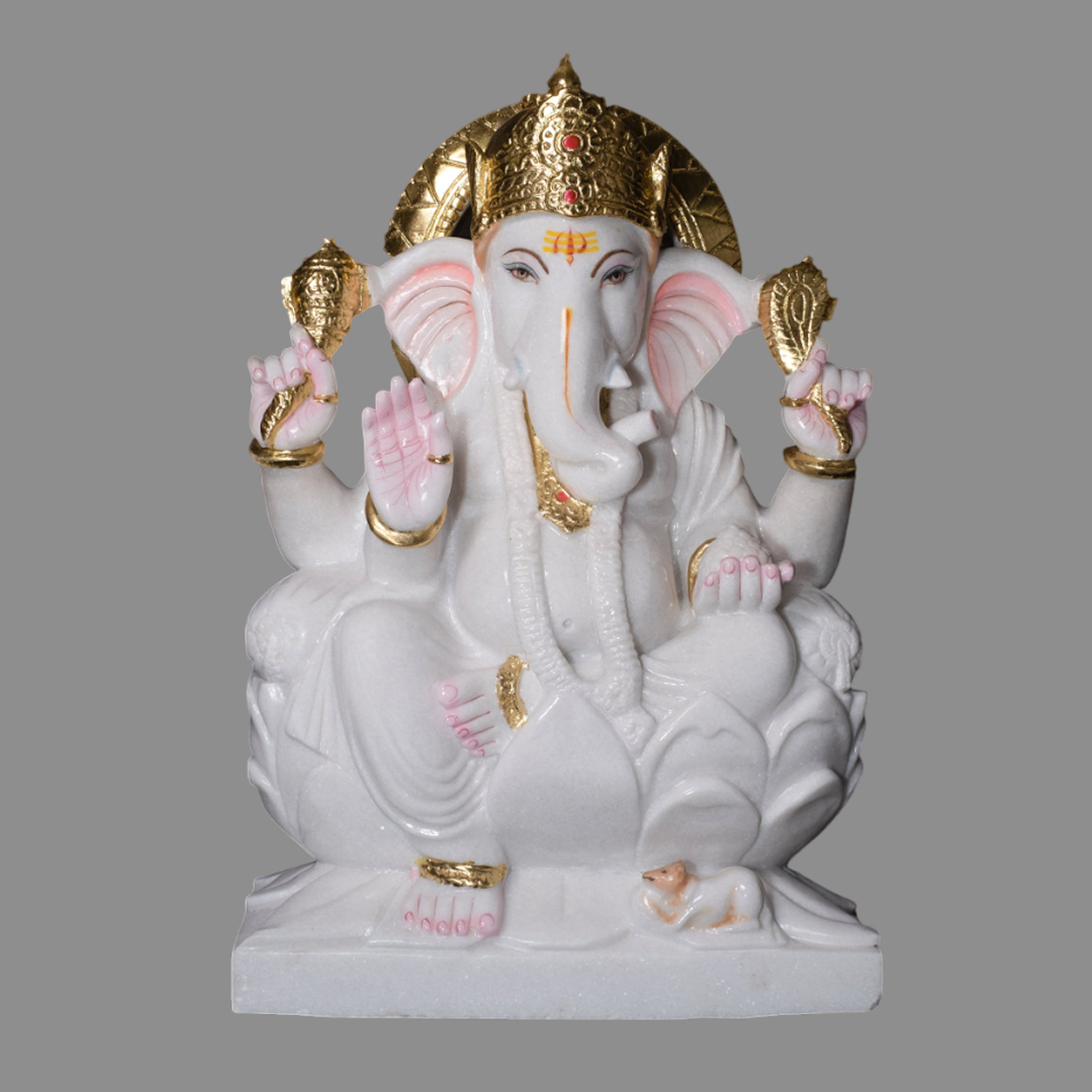 This divine Vietnam Marble Ganesh Ji Statue Sitting on Lotus beautifully depicts Lord Ganesh, the revered Vignaharta or destroyer of obstacles. Handcrafted from pure white Vietnam marble and adorned with gold-painted jewelry, this sacred Ganesh Ji murti radiates prosperity, happiness, and protection for your home. Featuring his vahan, the small mouse at his feet, this marble Ganesh idol for temple and pooja room adds elegance, spiritual energy, and divine blessings to any sacred space.